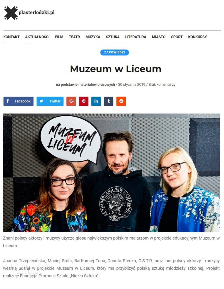 „Muzeum w Liceum to bardzo ciekawy projekt, który ma przybliżyć dzieciakom sztukę. Z mojego punktu widzenia edukacja kulturalna w szkole to bardzo ważny element w kształtowaniu człowieka, który sprawi, że w przyszłości będzie on chętnie chodził do muzeum, teatru, galerii sztuki i rozumiał otaczający go świat. Taki styl życia rozsmakuje go w teraźniejszości, będzie inaczej mówił, myślał i inaczej się ubierał. Będzie rozumiał kody kulturowe zaszyte w literaturze czy filmach i brał czynny udział w życiu kulturalnym.”