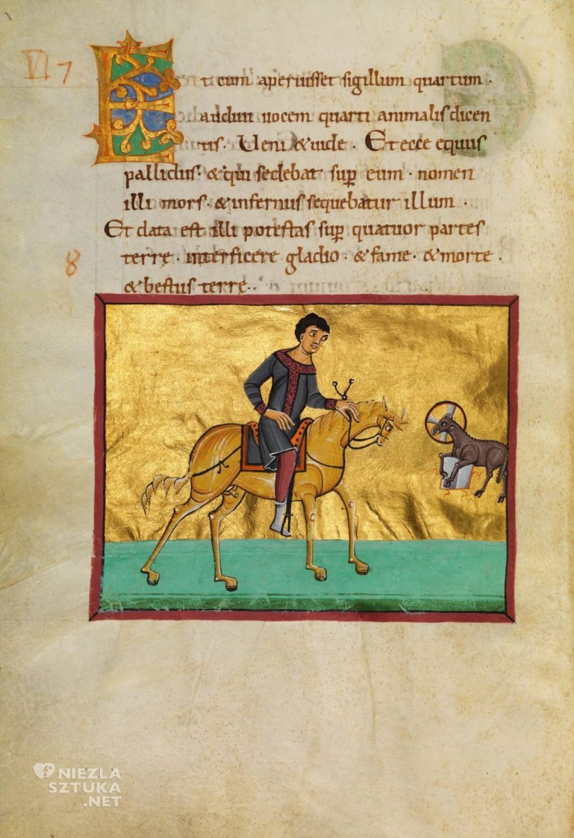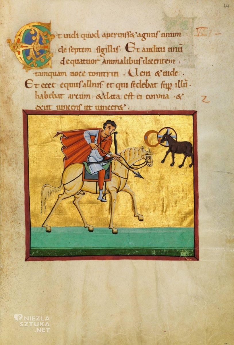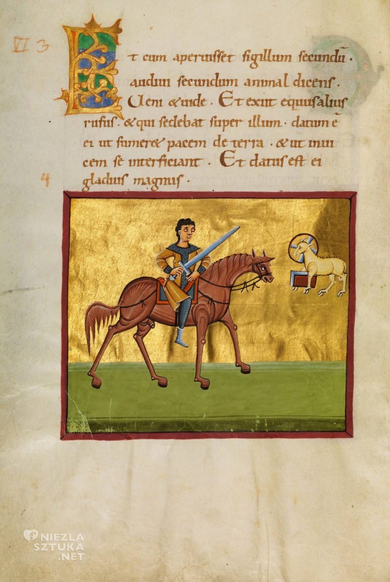 Przywołane miniatury, surrealistyczne w kolorystyce i portretowaniu jeźdźców, paradoksalnie w jak najlepszy, najtrafniejszy sposób oddają nastrój i tajemnicę sceny opisanej przez świętego Jana. W kolejnych stuleciach ikonografia Czterech Jeźdźców będzie coraz bardziej oddalać się od zawikłanej, trudnej wizualnie, mistycznej symboliki i przybliżać się do świata realnego, znanego, oswojonego. Jednym z wyjątków, które powstały wcześnie, a już realizowały ów proces, jest miniatura z Apokalipsy Bamberskiej – bogato ilustrowanego manuskryptu, który powstał około 1000 roku, w klasztorze w Reichenau. Jeźdźcy rozdzieleni na kartach kolejnych stron stanowią przedstawienie oddzielne, złączone nie tyle ze sobą, co z zapisanym tekstem – cytatem z Apokalipsy. Przedstawione postaci nie przypominają spersonifikowanych Zarazy, Wojny, Głodu i Śmierci, są jak najbardziej ludzcy. To dobrze ubrani, młodzi mężczyźni (dwaj z nich przybrani są w płaszcze spięte fibulą), w dłoniach trzymają swoje atrybuty (czwarty jeździec, Śmierć, nie posiada atrybutu, z kolei pierwszy zamiast łuku trzyma włócznię). Cała czwórka dosiada znakomitych wierzchowców, o lekkich, wysportowanych sylwetkach, długich nogach i zamaszystych ogonach. Każdemu jeźdźcowi towarzyszy Baranek z pieczęcią/księgą.