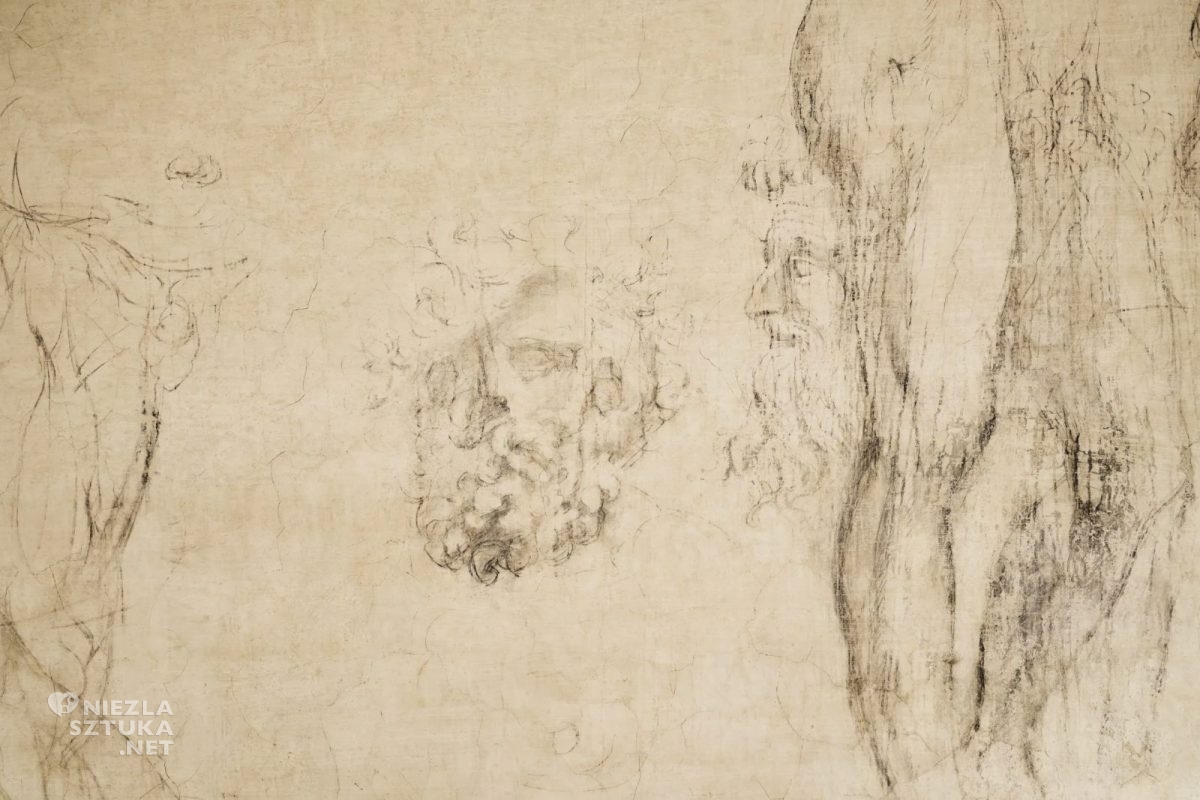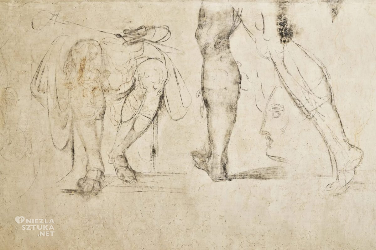 Docieramy do krótszej ściany, tej na wprost wejścia. Jest fascynująca. Elektryzuje ekspresją. Niemal w centrum, na pierwszym planie stoi naga kobieta, po jej lewej stronie piękny profil, może przyszłej alegorii Nocy, „zderza się” ze studium nogi.