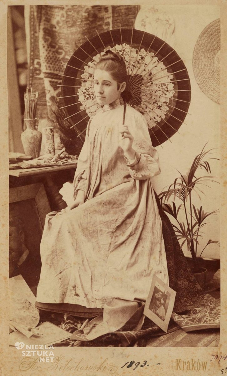 Mniej więcej w tym czasie w Krakowie wykonano dwie fotografie przedstawiające Boznańską z dalekowschodnimi rekwizytami, które dobitnie potwierdzają niezwykłą popularność japońskiej stylizacji. Jedna z nich przedstawia artystkę w jej krakowskiej pracowni: w malarskim fartuchu z parasolką. Wskazują na to rozmaite malarskie rekwizyty, między innymi zawieszony na ścianie słomkowy kapelusz modelki pozującej w obrazie W oranżerii (1890) oraz kwiaty w doniczce, ustawione na stole przybory malarskie, wzorzysta zasłona i olejny portret mężczyzny, w ramach, a także niedbale porozrzucane szkice. Fotografię tę wykonał krakowski zakład Kacpra Żelechowskiego. Zapewne podczas tej samej sesji fotograficznej Boznańska uwieczniła się także w chińskim kaftanie, z japońską parasolką przedstawioną w obrazach. Na obu ujęciach uczesanie artystki przypomina fryzury Japonek z rycin.