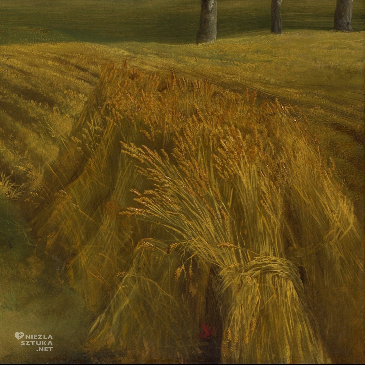 „Uprzywilejowany status i ziemiański dobrobyt pana i pani Andrews podkreślają również kłosy zboża w rogu sceny, stada owiec czy rozciągające się dookoła lasy. Pominięto tu za to ludzi, których to praca jest tak naprawdę źródłem bogactwa Andrewsów. Służba została ukryta, bogactwo właścicieli ma reprezentować jedynie ziemia wraz ze swoimi plonami”6.