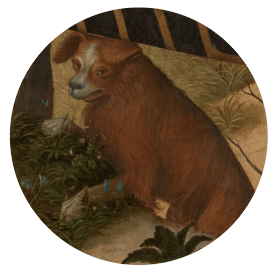 Z prawej strony, tuż za sportretowanym rycerzem, pojawia się brązowy pies o oklapniętych uszach i nieco kudłatej sierści, jego pysk przypomina nieco ludzkie oblicze, a spojrzenie skierowane jest wyraźnie do widza.