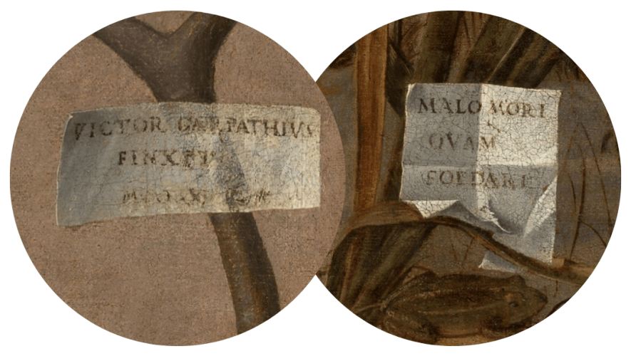 Dodatkowy ważny element dzieła stanowią dwie iluzjonistyczne karteczki – tak zwane cartellini („kawałki papieru”). Pierwsza z nich, wplątana w liście, widniejąca przy gronostaju, zawiera inskrypcję z mottem: „MALO MORTI /QUAM /FOEDARI” („Śmierć jest lepsza od hańby”), drugą, opartą o drzewo, wypełnia zapis: „VICTOR CARPATHIUS/ FINXIT? M.D.X.”. Cartellini pojawiły się w renesansowym malarstwie włoskim w wieku XV i XVI, głównie zaś w malarstwie weneckim w okresie od lat 70. XV wieku do 20. XVI stulecia. Trzeba jednak zauważyć, iż były one również obecne w malarstwie innych, późniejszych artystów europejskich, na przykład Hansa Holbeina czy Francisco de Zurbarána. Cartellini pełniły funkcję „szczególnego znaku” – „firmowego znaku twórcy”2.