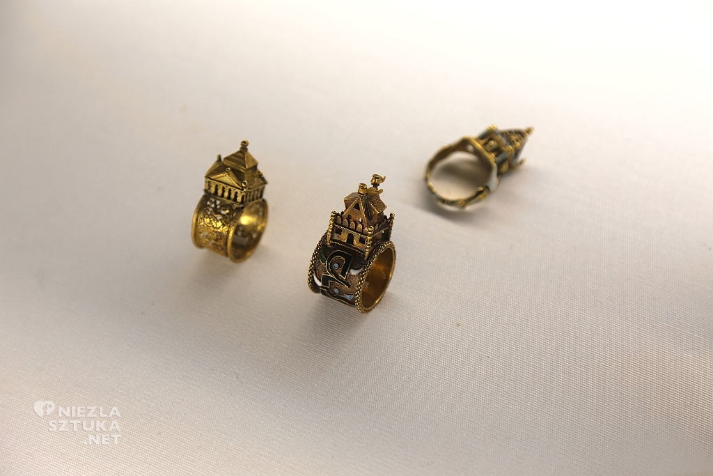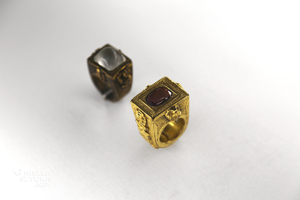 Och! Ileż wrażeń i bodźców dla naszych zmysłów. Nim udamy się na drugie piętro zajrzyjmy jeszcze do stołowych gablot, w których kryje się kolekcja pierścionków. Od egipskich, przez rzymskie, chrześcijańskie i żydowskie, wszystkie wykonane ze złotego kruszcu. Najmłodsi odwiedzający również mogą przyjrzeć się skarbom ukrytym w owych gablotach, dzięki przygotowanym specjalnie dla nich drabinko – taboretom.