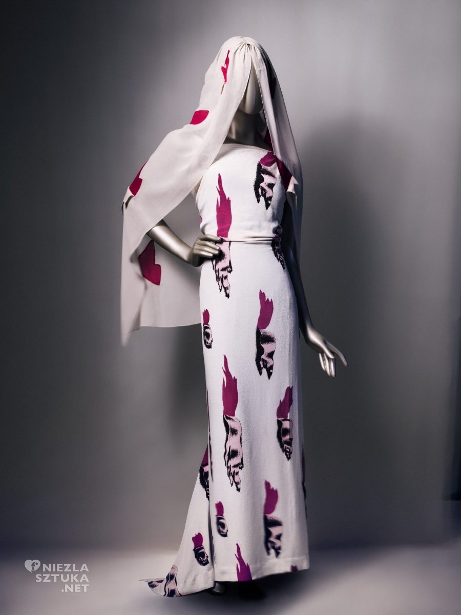 W podobny sposób do idei przekraczania barier odnosił się zestaw składający się z sukni, rękawiczek i welonu, uszytych z materiału, którego nadrukowany wzór imitował jego podarcie7. Dopełnieniem kreacji był pasujący kolorystycznie biało-fioletowy welon, na którym fragmenty wzoru dodatkowo zwisały, imitując podarcie. Motyw ten pojawia się w obrazie Trzy młode surrealistyczne kobiety niosące skóry orkiestry, który Dali namalował w 1936 roku.
